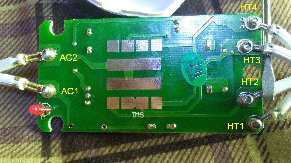 When one looks at the readings it looks like all the windings in the pad are always used regardless off which position switch is in and following ohms they are all similar that is why you get same heat and current draw. I had a different pad that had only 3 wires to pad and that was hooked similar although it had two little devices inside between heating wires but I don't know if they where to act as a thermostat when get hot resistance goes up or they where to be used as just a safety switch. I am going to leave it as it as I do not need any thing hotter but would like cooler . Path from ac2 to ht4 is straight thru if one cuts trace on board and inserts common diode of 2 amp rating will this not lower heat and power draw?Your resistance readings could suggest (3) identical elements (290, 300, and 305 ohms are within 5% of one another) using HT1 as a common point, but this would make sense only if the crossbar was progressive (that is, only HT4 was turned on when slid all the way to that side, then adding the other heaters in order - HT3, then adding HT2 (through D2, at 1/2 current), then finally HT2 at full power) as it was slid to the other side.Instead, the pictured crossbar acts as a 2 pole, 4 position switch, and connects either HT4, OR HT3, OR HT2 (through D2), OR HT2 to the 'AC2' return. I don't know what to make of this, but it makes me wonder about the heater elements.